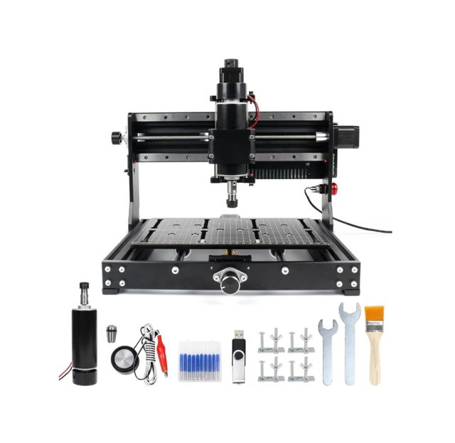 Detalles del productoFresadora grabadora laser CNC 3020 Plus con motor de 500W. 3 ejes cnc router para grabado GRBL control, xyz área de trabajo 300 × 200 × 72 mm, motor husillo 500w, con tope y fresa cnc de emergencia.