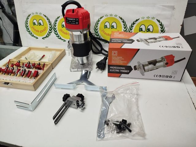 Detalles del productoFresadora Trimmer con 16 fresas y accesorios, artÃculo nuevo! Potencia 800w, Velocidad 30000rpm, incorpora caja con 16 fresas para diferentes tallados en madera, precio conjunto 60€