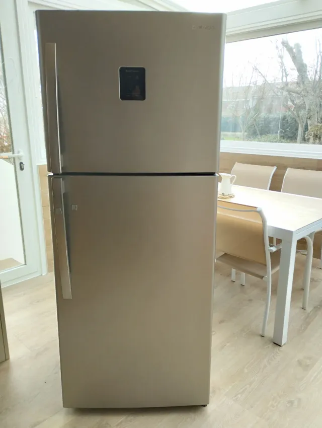 Detalles del productoFrigorífico Daewoo de dos puertas en color plateado.