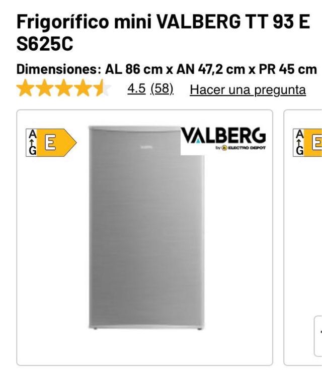 Detalles del productoFrigorífico mini de la marca VALBERG, modelo TT 93 E S625C. Sus dimensiones son 86 cm de alto, 47,2 cm de ancho y 45 cm de profundo.
