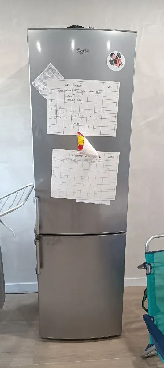 Detalles del productoFrigorífico de la marca Whirlpool en color plateado. Cuenta con dos puertas, una para el congelador y otra para el refrigerador.