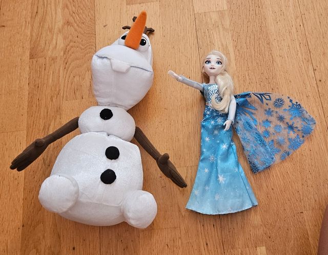 Muñeca Elsa y peluche Olaf que habla y canta de Frozen. Ambos están en buen estado. - Muñeca Elsa con vestido azul. - Peluche Olaf de tamaño mediano.