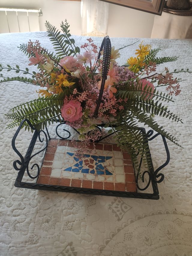 - Base de mosaico de cerámica con detalles azules y marrones.