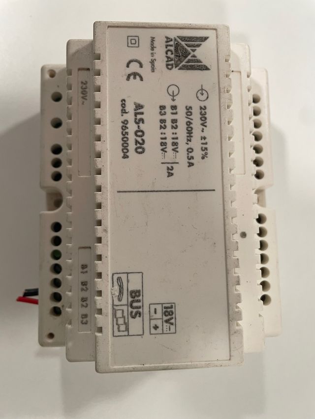 Especificaciones: 230V~±15%, 50/60Hz, 0.5A de entrada; 18V, 2A de salida para el bus. Fuente de alimentación ALCAD modelo ALS-020.