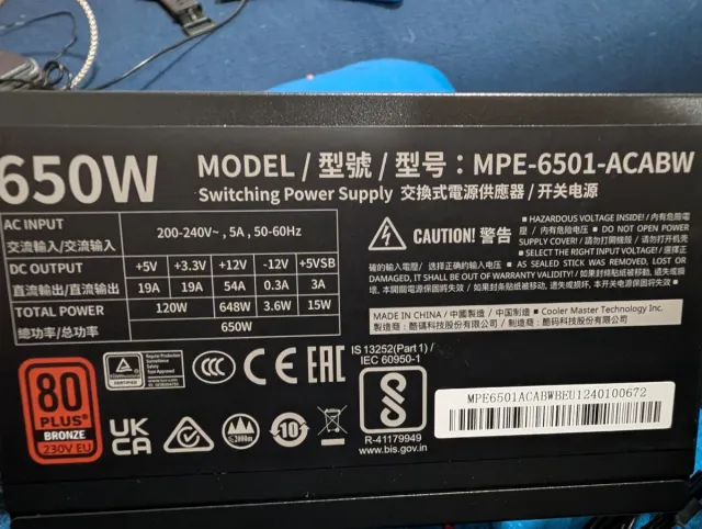 Detalles del productoFuente de alimentación Cooler Master de 650W, modelo MPE-6501-ACABW. Cuenta con certificación 80 PLUS Bronze.
