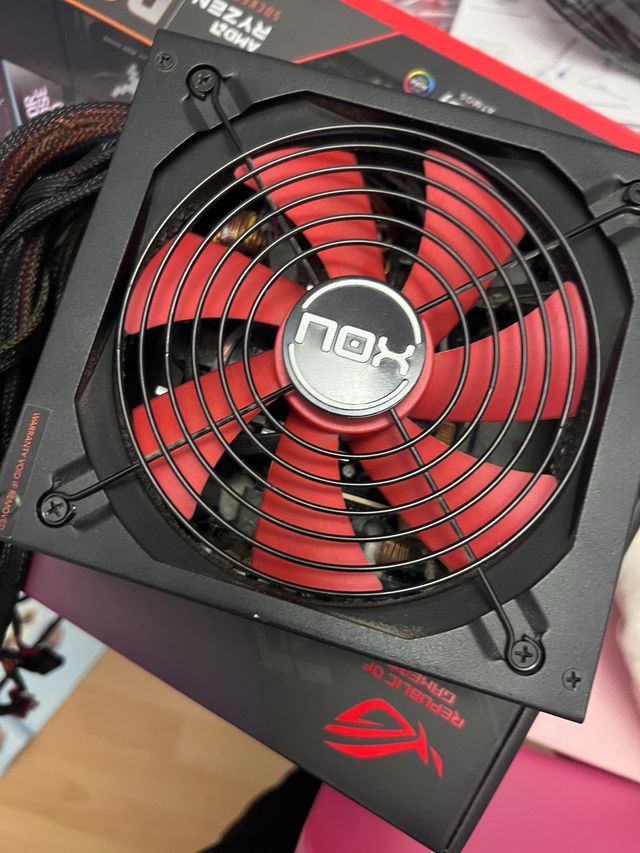 Fuente de alimentación NOX NXS750 con ventilador rojo. - Diseño robusto y eficiente. - Ventilador de 120mm con aspas rojas.