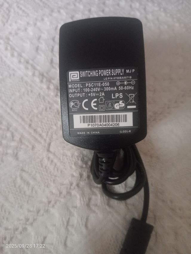 Fuente de alimentación Phihong modelo PSC11E-050. - Entrada: 100-240V~ 300mA 50-60Hz. - Salida: +5V= 2A. - Fabricado en China.