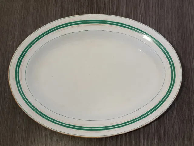 Presenta un diseño clásico con un borde decorado con finas líneas verdes.