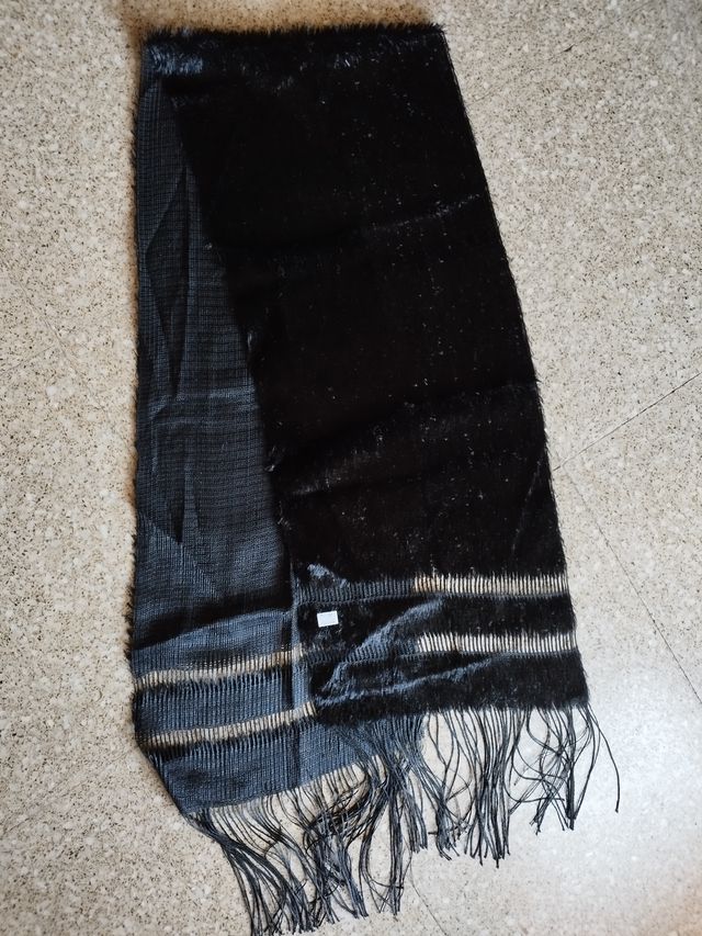 Detalles del productoFular de mujer de color negro para celebraciones. Elegante, agradable al tacto. Usado solo en una boda. De poliester 100%. Acabado como en terciopelo fino con flecos y zonas con transparencias. Sus dimensiones son de ancho 31 cm y de largo sin la medida del fleco 1,60cm y con fleco 1,96cm