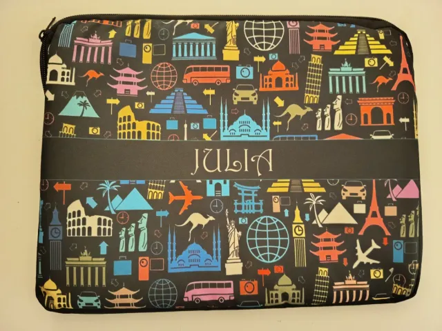 Detalles del productoFunda para portátil, tablet o chromebook. Para 12" (un poco holgada) y para 13" (un poco justa). Color negro, con un divertido diseño de iconos de monumentos y viajes de alegres colores. Acolchada y con cremallera. Banda central con el nombre JULIA serigrafiado (el nombre pasa bastante desapercibido).