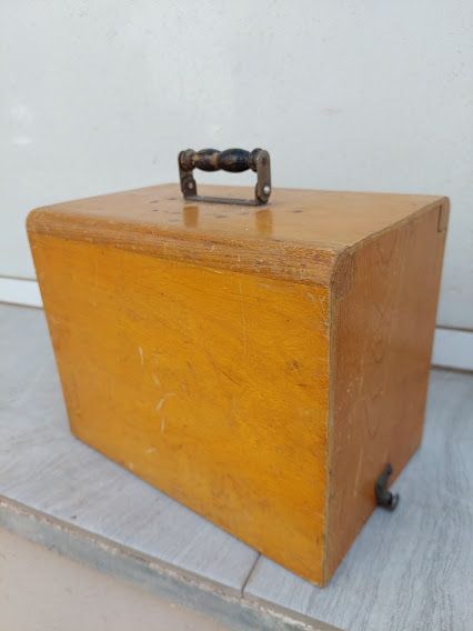 Detalles del productoBonita y antigua funda de maquina de coser en miniatura, portatil en madera de los años 40/50. Una bonita pieza ideal para completar una pequeña maquina con su funda. Mide 25cm. de largo por 16cm. de fondo y 19cm. de alto.