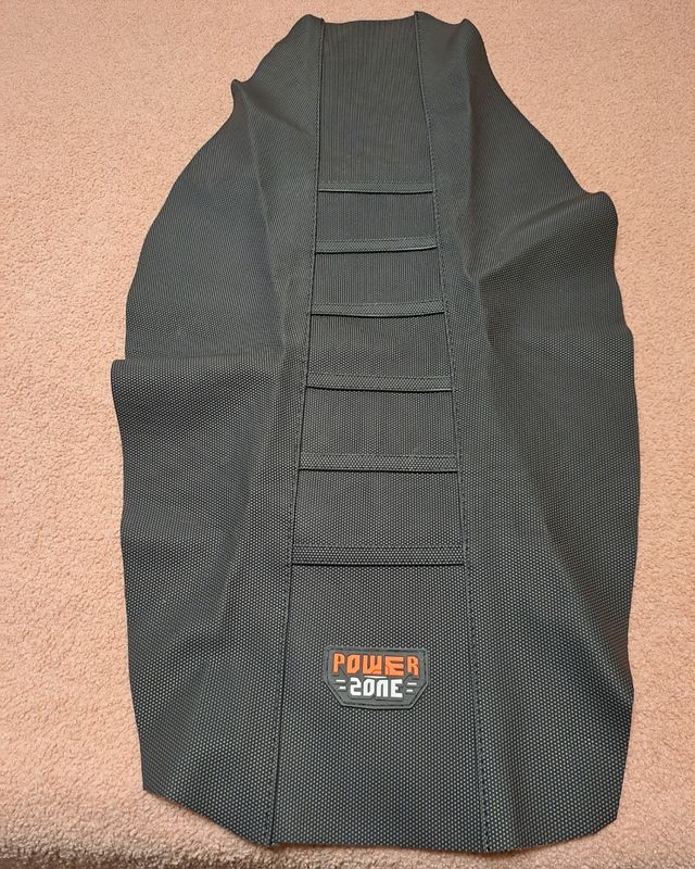 Funda de asiento para motocicleta con diseño texturizado. - Color gris oscuro. - Detalle de costuras en relieve. - Logo POWER ZONE en naranja y gris.