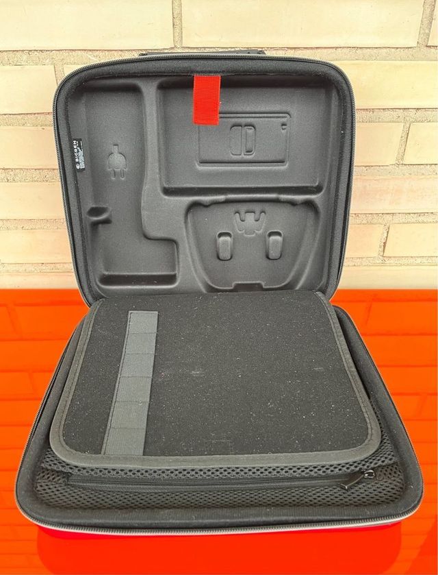 Funda protectora para Nintendo Switch. - Diseño interior moldeado para consola y accesorios. - Compartimento de malla con cremallera.