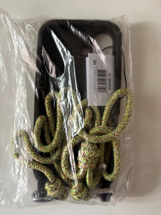 Funda para iPhone 16 con diseño moderno y cordón. - Color negro. - Cordón trenzado en tonos verde y rojo. - Incluye detalle metálico en el cordón.