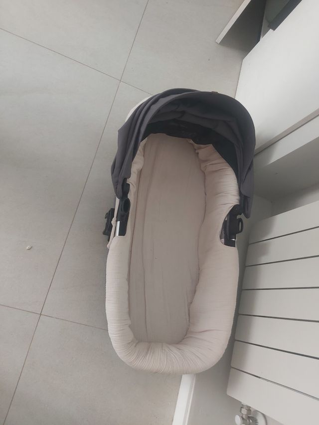 Funda para capazo de bebé en tejido de bambula. Color beige. Marca giraffa bianca e blu. Incluye bajera a juego. Está en perfecto estado