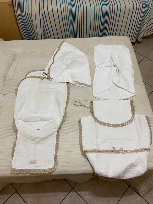 Funda en piqué del capazo con colcha, funda silla a juego y capota que sirve tanto para el capazo como para la silla. Marca Marilo.