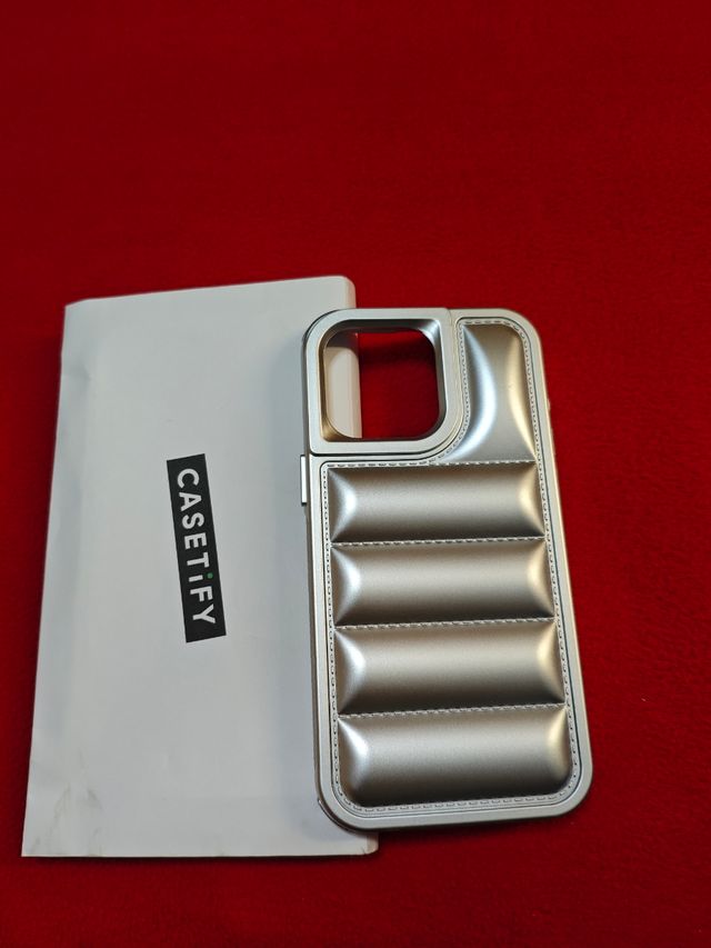 Funda para iPhone 15 Pro Max con un diseño acolchado y elegante. - Acabado plateado brillante. - Diseño acolchado con costuras. - Marco protector.