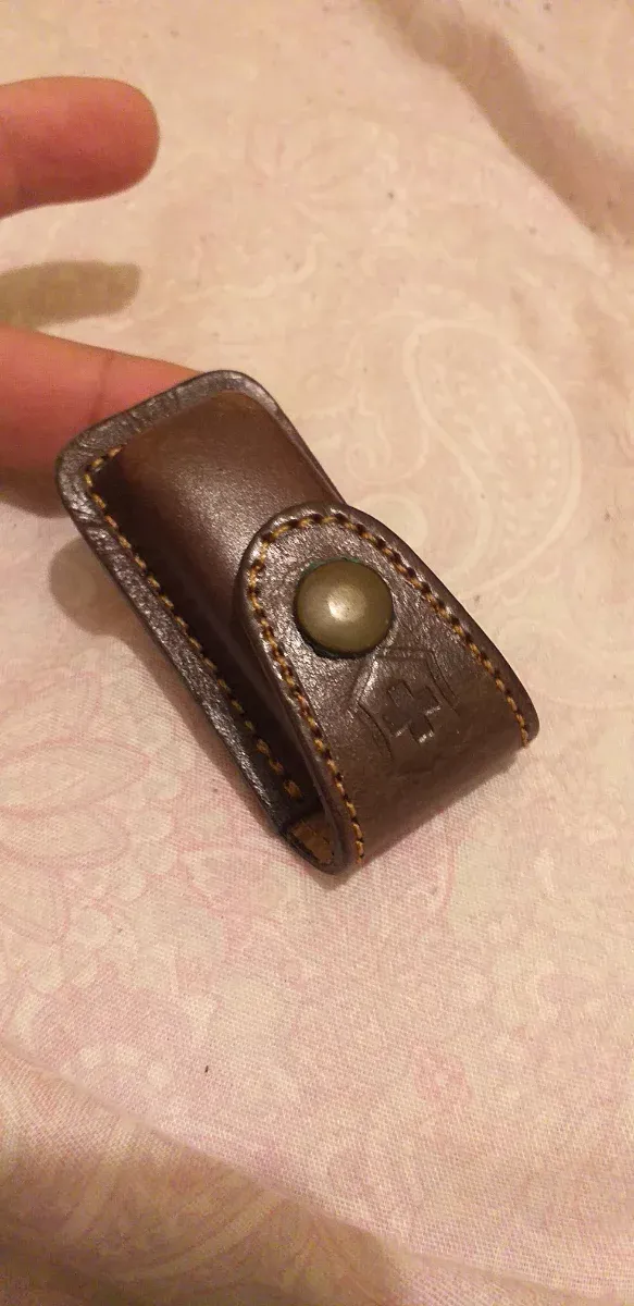Funda de cuero marrón para navaja o multiherramienta. - Cierre con botón a presión. - Costuras reforzadas. - Diseño clásico.