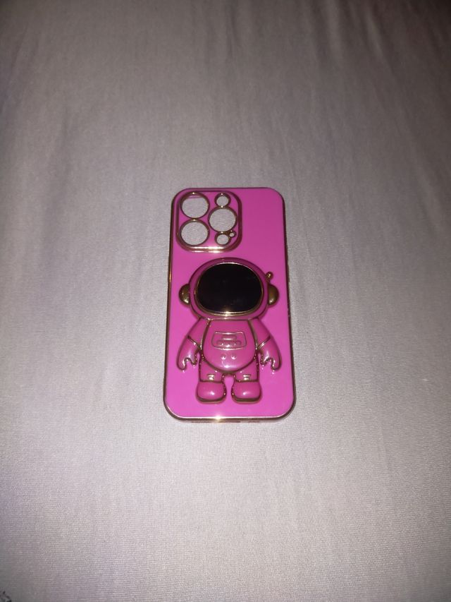 Vendo funda de iPhone 13 pro color rosa y dorada. Con Apollo para sostener el móvil, con decorado de astronauta. Precio negociable