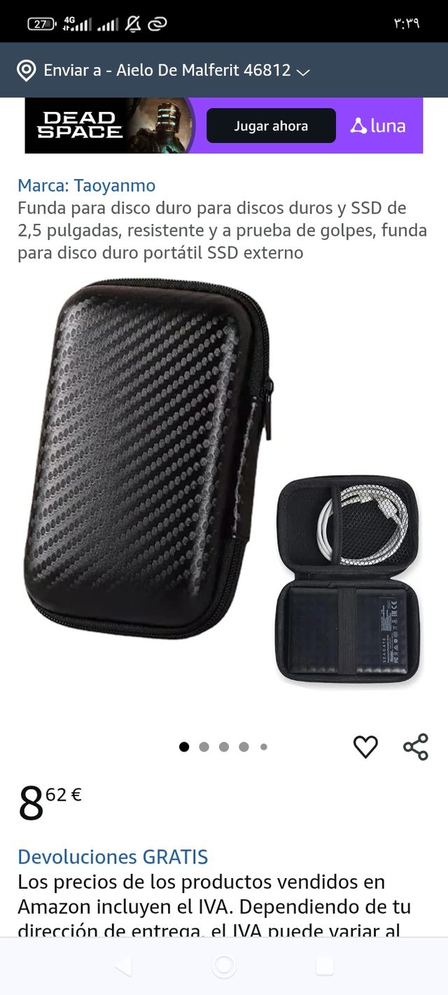 Detalles del productoFunda protectora para disco duro o SSD de 2,5 pulgadas. Es resistente a golpes y de color negro. Incluye una funda rígida con espacio para el disco y un cable. Ideal para transportar tu disco duro portátil de forma segura.