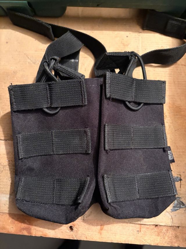Funda doble para cargadores de G36. Fabricada en material textil resistente y con sistema MOLLE. - Color negro. - Cierre con solapa. - Dos compartimentos individuales.