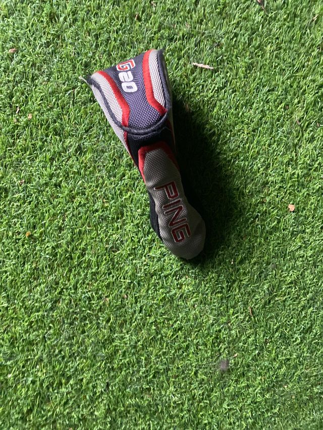 Funda protectora para palo de golf híbrido de la marca Ping. - Modelo G20. - Diseño en gris, rojo y azul marino. - Logo de Ping visible.