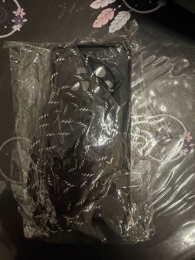 Funda para móvil con un diseño moderno y práctico. - Color negro. - Incluye cuerda para llevarla colgada. - Diseño con zigzag blanco.