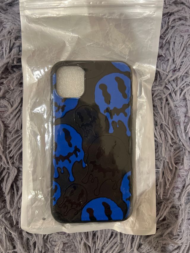 Funda para iPhone 11 con un diseño llamativo de caras sonrientes. - Color negro con detalles en azul. - Estampado de caras con efecto dripping.