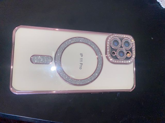 Detalles del productoPreciosa funda para iPhone 11 Pro. ✨ Tiene un diseño elegante y brillante con pedrería. La funda es de color rosa dorado y protege la parte trasera y los laterales del teléfono.