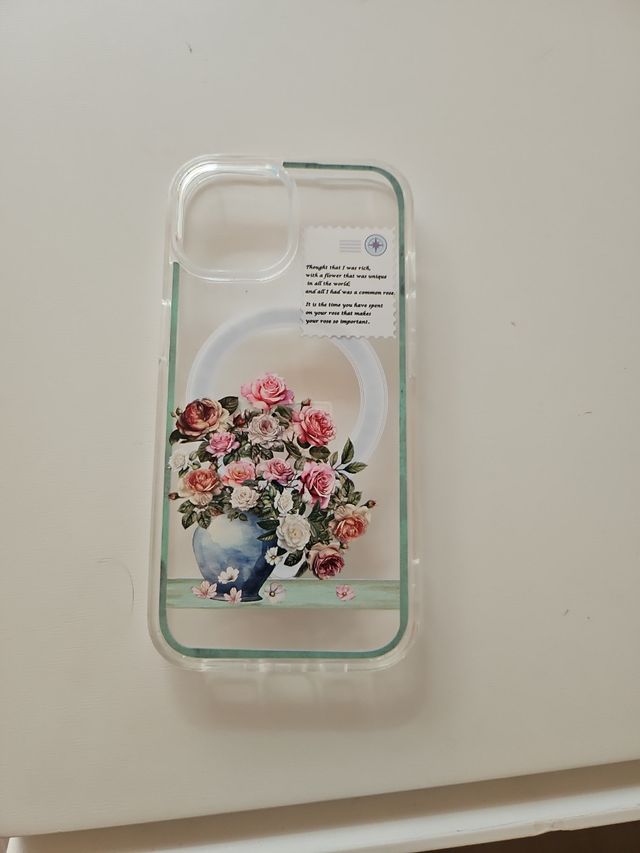 Detalles del productoPreciosa funda transparente para iPhone 12 Pro Max. Tiene un diseño floral con rosas en un jarrón azul. La funda se ve en muy buen estado.