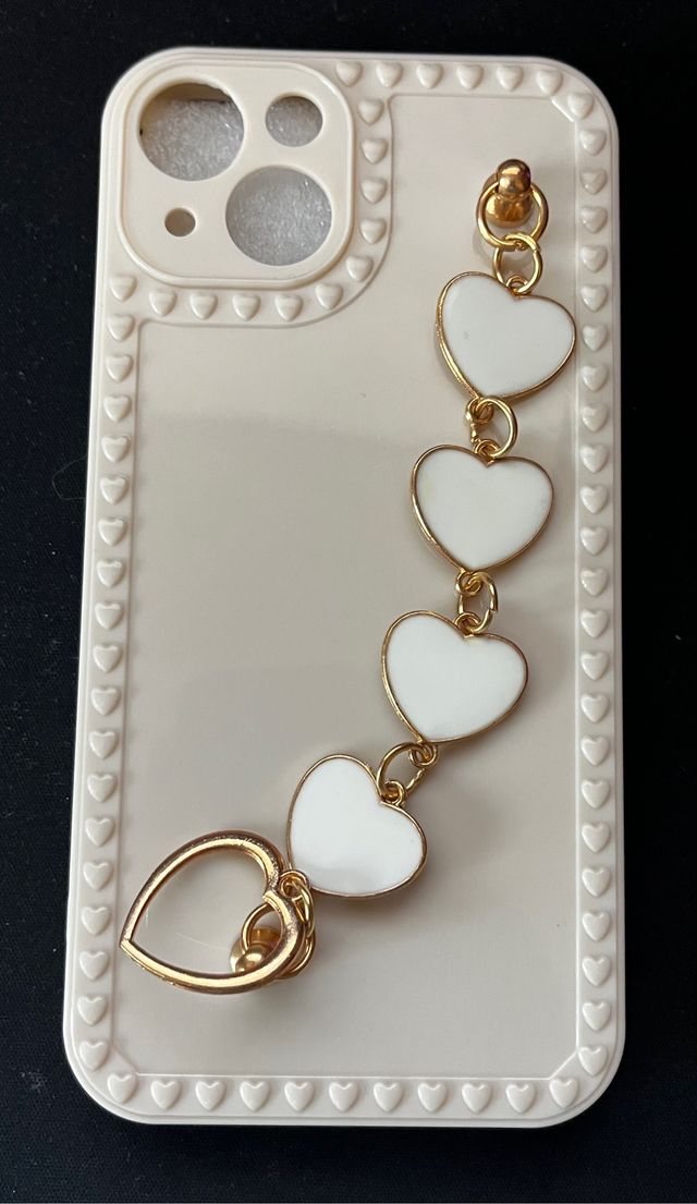 Funda color beige para iPhone 13 con cadena de corazón. Está sin usar.