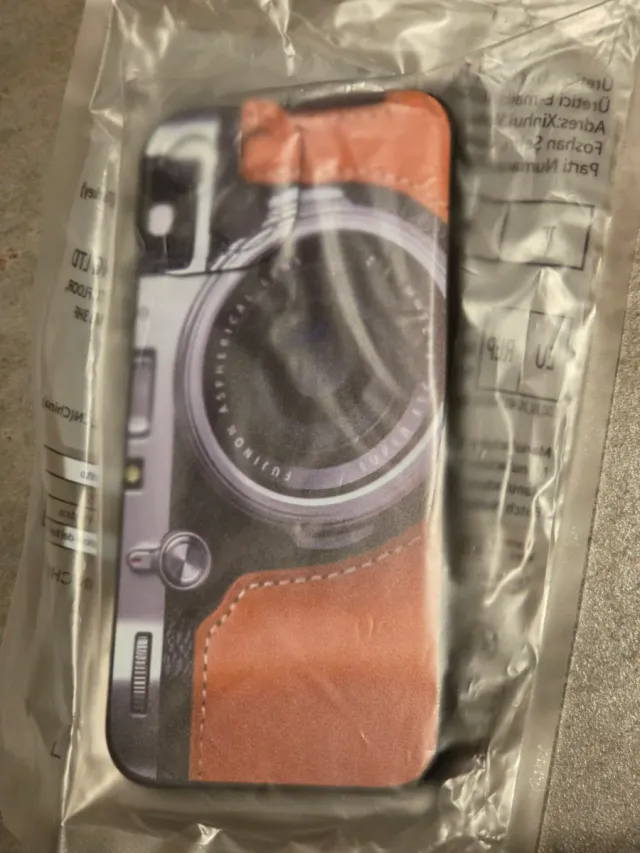 Funda para iPhone 13 mini con diseño de cámara Fujifilm. - Estilo retro de cámara fotográfica. - Acabado en imitación piel naranja.