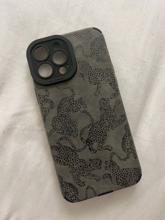 Funda para iPhone 13 Pro Max con un diseño de estampado de leopardo. - Estampado de leopardo en relieve. - Color gris oscuro.