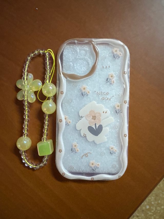 Funda para iPhone 14 con un diseño encantador y un colgante a juego. - Diseño con flores. - Colgante de cuentas y flor. - Acabado transparente con detalles.