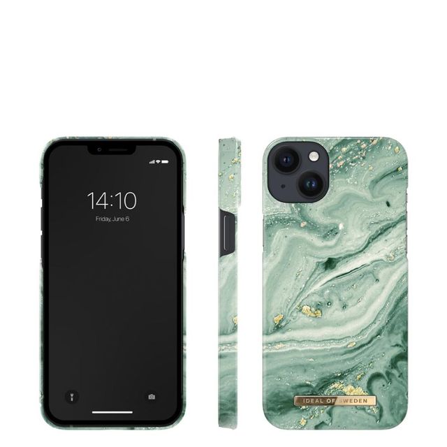 Detalles del productoFunda para iPhone 14 Plus con un diseño de mármol en remolino verde menta y detalles dorados.