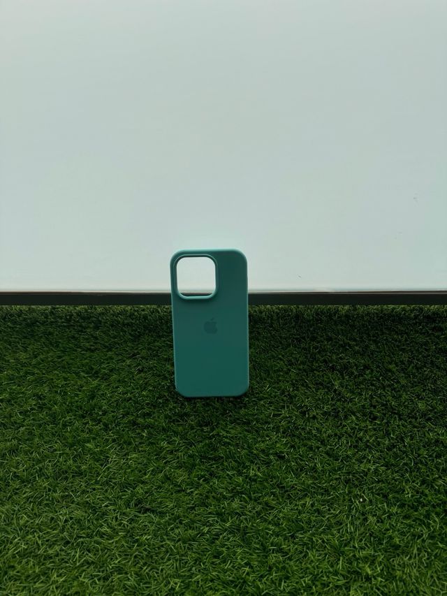 Detalles del productoFunda o Silicone Case Cover con el logo de Apple, para iPhone 14 Pro. Es azul aguamarina.