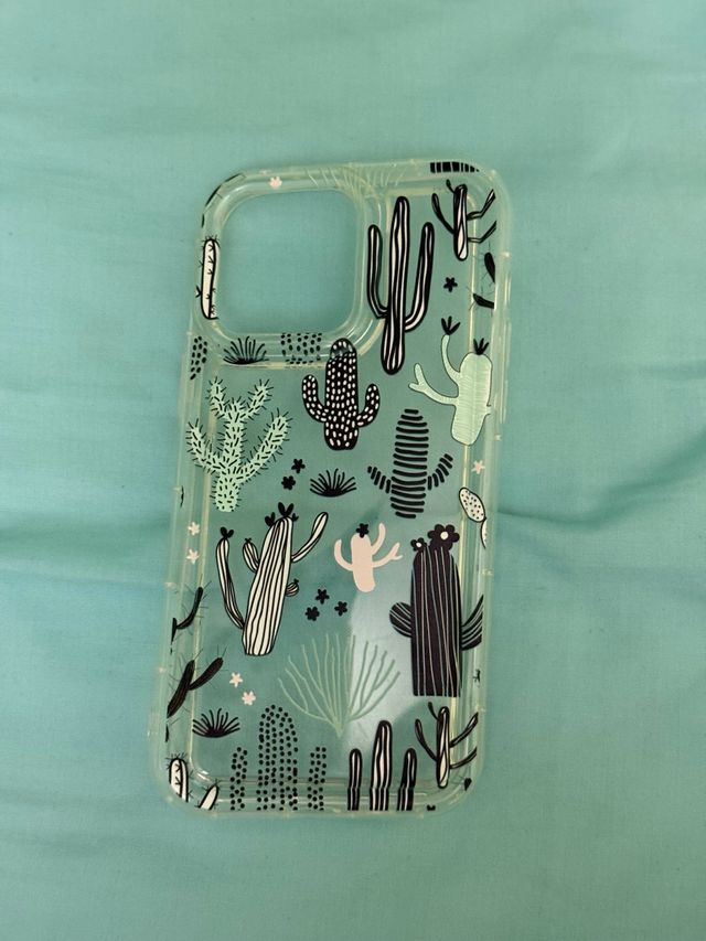 Detalles del productoPreciosa funda transparente para iPhone 14 Pro Max. Tiene un diseño con cactus en tonos verdes y negros. - Está en perfecto estado. - Diseño original y elegante. - Protege tu teléfono de golpes y arañazos.