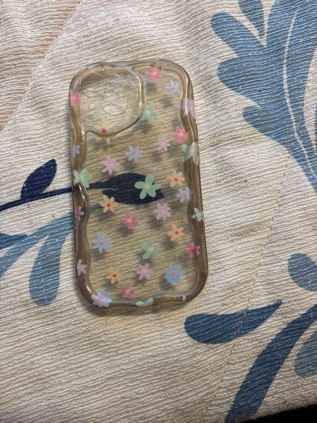 Funda protectora para iPhone 15 con un diseño floral. - Diseño transparente con flores de colores. - Bordes ligeramente ondulados.