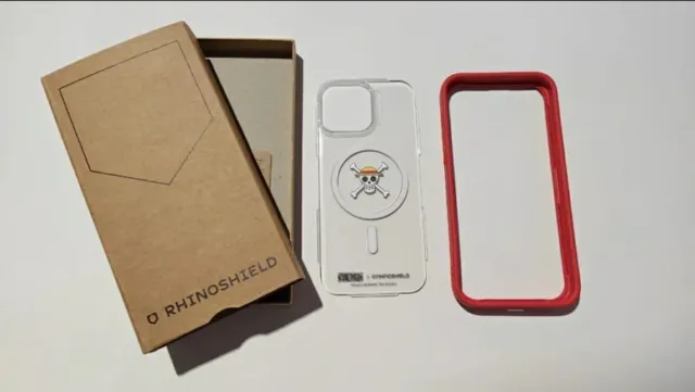 Funda modular RhinoShield para iPhone 15 Pro Max. - Diseño transparente con estampado. - Incluye marco rojo.