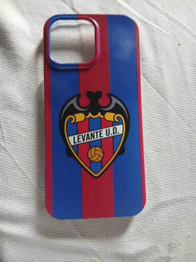 Funda para iPhone 16 Pro Max con diseño de rayas rojas y azules y el escudo del Levante U.D. - Diseño deportivo. - Colores: rojo y azul.