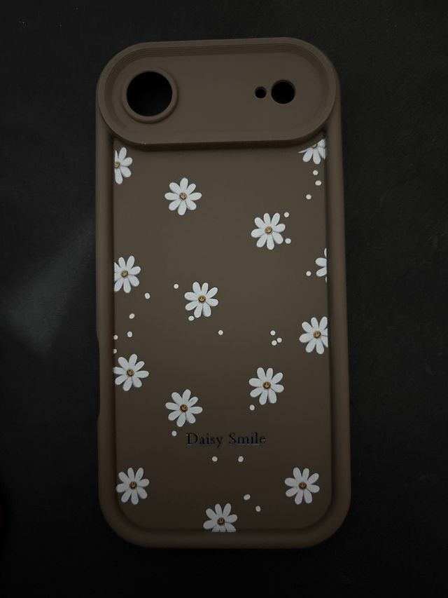 Funda para iPhone 17 AIR con un bonito diseño de margaritas y puntos sobre fondo marrón. - Diseño floral. - Color marrón. - Texto Daisy Smile.