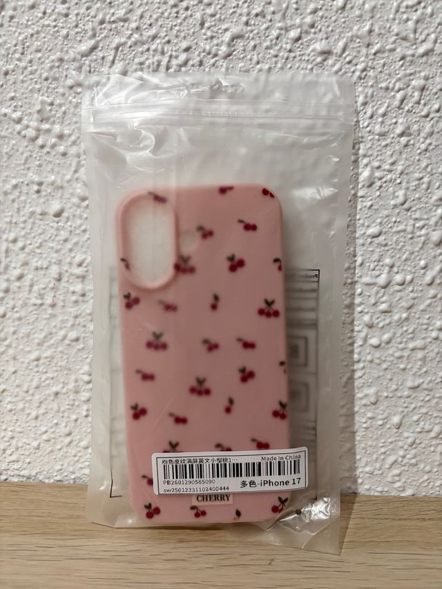 Funda para iPhone 17 con un bonito estampado de cerezas sobre fondo rosa. - Diseño de cerezas en toda la funda. - Color rosa. - Marca: CHERRY.