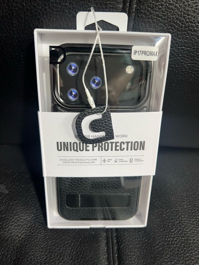 Funda de piel negra para iPhone 17 Pro max . Ofrece protección y un diseño elegante. - Material: Piel. - Diseño: Protección única. - Instalación: Snap-on.
