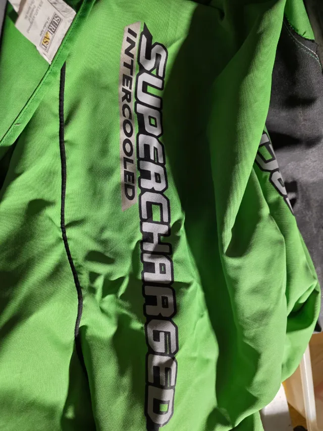 Funda para Kawasaki Jet Ski 310 R. Protege tu moto acuática con esta funda. - Color verde brillante. - Diseño con texto SUPERCHARGED INTERCOOLED en blanco y negro.
