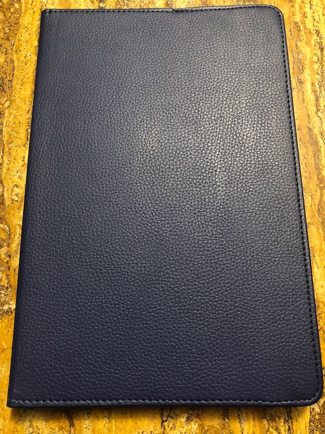 Funda compatible con tablet de lenovo m10 de 10.61 pulgadas. Es azul marino de piel y puede girarse la parte de la tablet.
