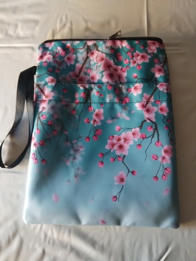 Detalles del productoFunda literaria o tablet un bonito estampado de flores de cerezo sobre un fondo degradado en tonos turquesa y azul claro.