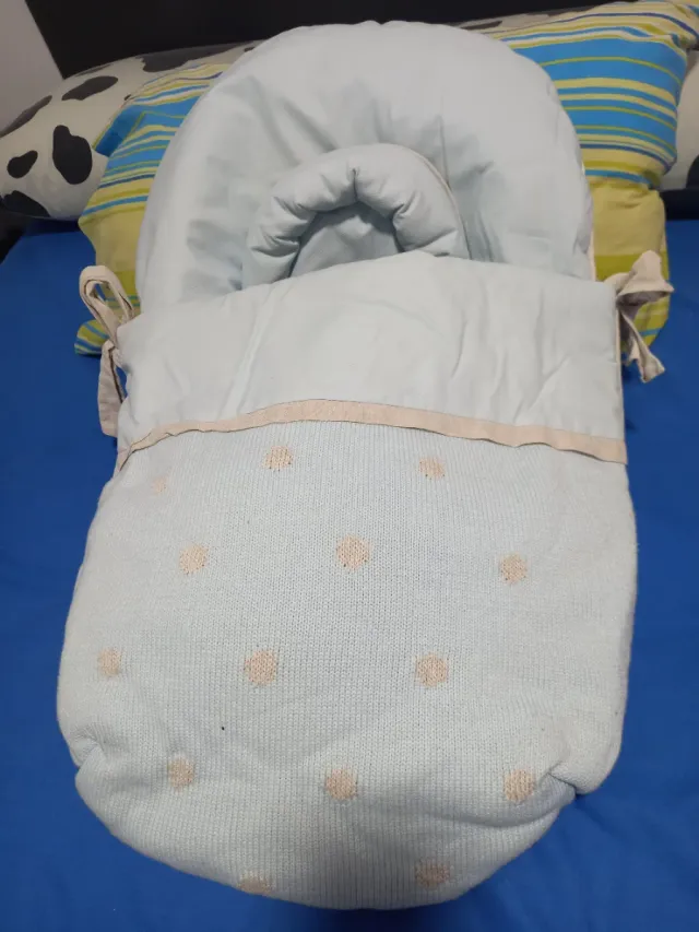 Funda universal para silla de coche Maxi-Cosi de la marca Pili Carrera. Fabricada en tejido de punto azul claro con pequeños topos en tono melocotón.