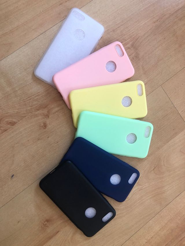 Fundas de colores transparente, rosa, amarillo, verde, azul oscura y negra.