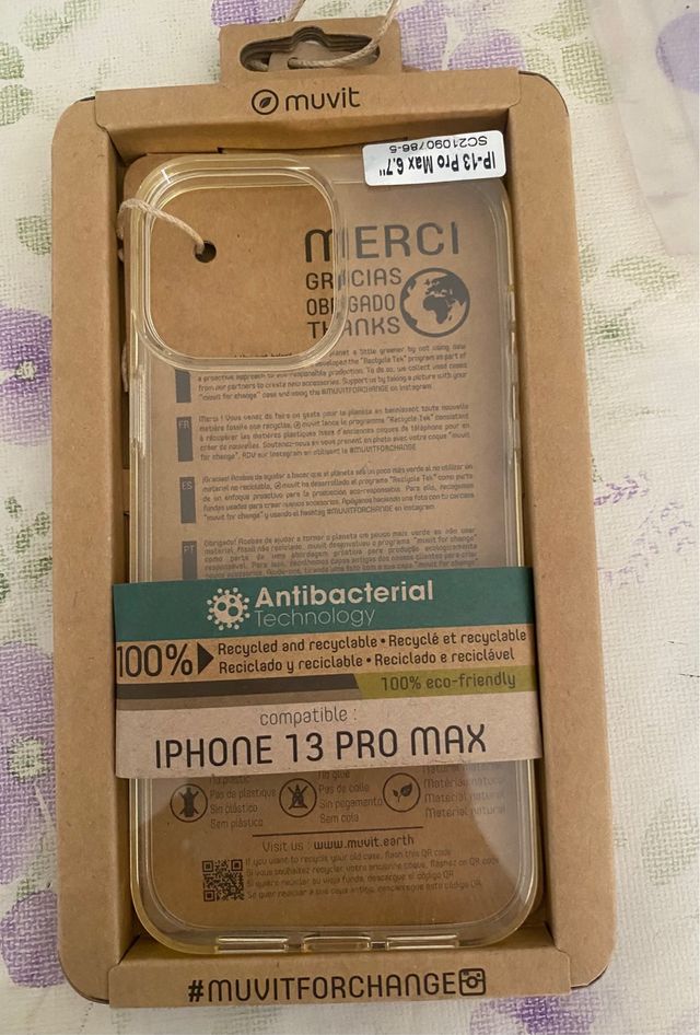 Funda protectora para iPhone 13 Pro Max. - Tecnología Antibacterial. - 100% reciclada y reciclable. - Diseño transparente.