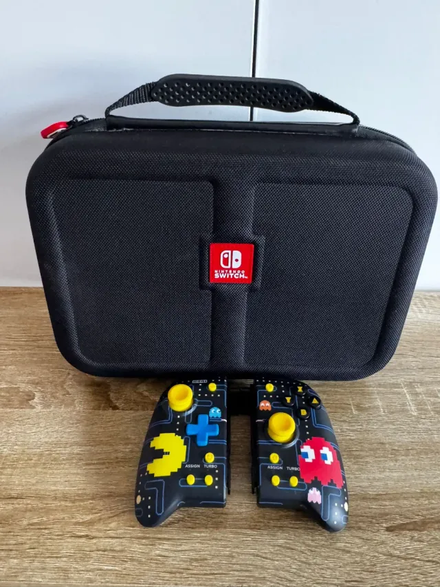 Detalles del productoFunda de transporte para Nintendo Switch con diseño de Pac-Man, junto con un par de mandos Joy-Con split pad HORI personalizados.